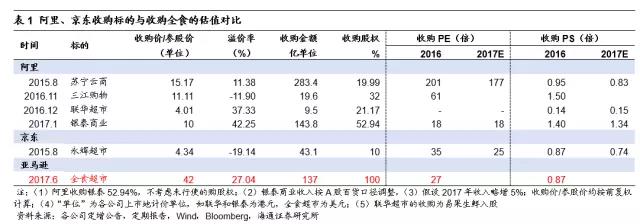 对比估值看,亚马逊此次收购全食超市对应其2016年PE约27倍,PS约0.87倍,整体估值与京东参股永辉相当(PE 35x、PS 0.87x),低于阿里入股的超市三江购物(PE 61x、PS 1.5x),处于低位的合理水平,收购的27%溢价率则处于较高水平。另外我们发现,A股公司因收购前估值偏高,入股一般溢价不高或有一定折价,而港股和美股公司的入股则一般为溢价,体现出A股与海外估值差异。