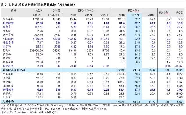 (a)PE估值,在港台欧美超市个股中,除永旺集团2017年EP超70倍以外,其他个股均低于35倍,全食超市PE约33倍,而沃尔玛、意马特、家乐福、塔吉特等公司均低于20倍;A股中仅永辉超市(37倍)和家家悦(22倍)低于50倍,其他个股PE均较高,主要是由于较低的盈利水平所致。从PS来看,A股平均1.06倍,略高于国际同业的0.9倍。