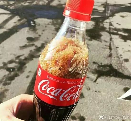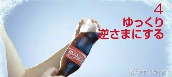 从下图看到,从贩卖机取出后,先拧开喝一口,然后倒立过来摇一摇,就会发现里可乐面出现冰沙,喝起来口感更好。