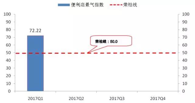 2017年第一季度便利店总体景气指数为 72.2,高出荣枯线 22.2, 体现出便利店从业者在 2017 年开年之局,对便利店行业的发展趋势保持较为乐观的态度。