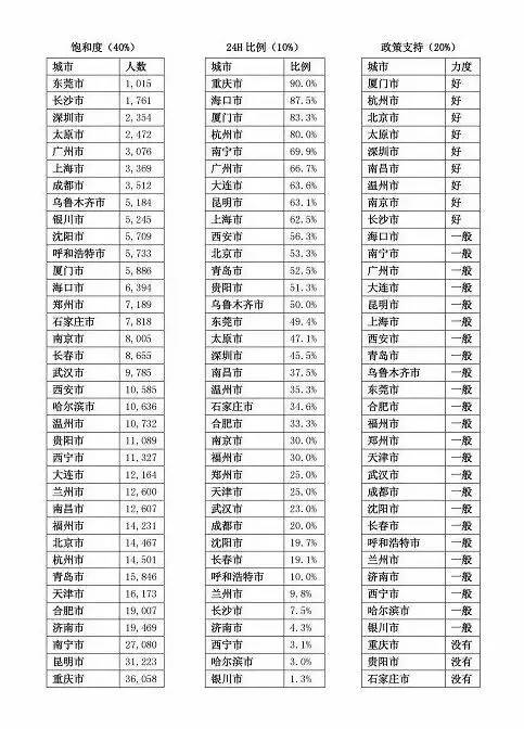 其中:增长率=(2016 年门店总量/2015 年门店总量-1)*100% 饱和度=2016 年该城市总人口数/2016 年该城市门店总量 24H 比例=该城市 24H 总量/该城市门店总量*100%