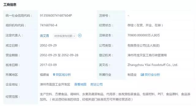 小食代查阅到的工商信息显示,伊莱福是一家总部位于福建漳州的生产制造企业,成立于2002年,注册资本为7.08亿,经营范围包括:生产饮料、方便食品、调味料、水果及蔬菜制品、代用茶;批发预包装食品、包装材料、PET、食品原料、食品添加剂(依法须经批准的项目,经相关部门批准后方可开展经营活动)。