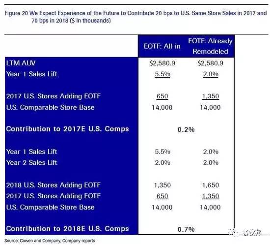 假设各店每年增设EOTF的速度是平均的,我们预计2018年将有3000家门店增设EOTF,这将为美国同店销售贡献70个bp(下图)。麦当劳此前宣布计划在2017年翻新650家餐厅,我们预计这些餐厅同时也会增设EOTF。