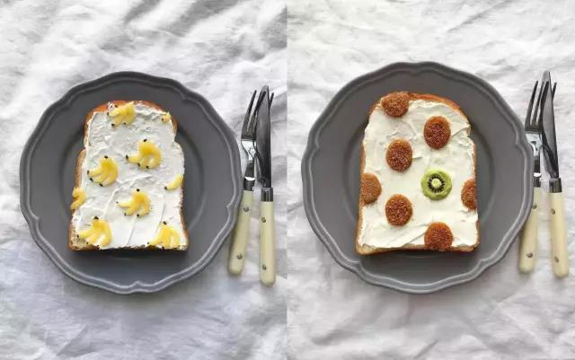 这些「水果系列」的花样吐司制作的方式都是在单片吐司上用各种果酱或奶油来绘制出迷你水果。如奇异果,就是先在吐司上抹上酸奶油做为白色基底,接着用花生酱画出奇异果外型,然后在上面撒上压碎的玉米片,就可以充份表现奇异果外皮毛绒绒的感觉。