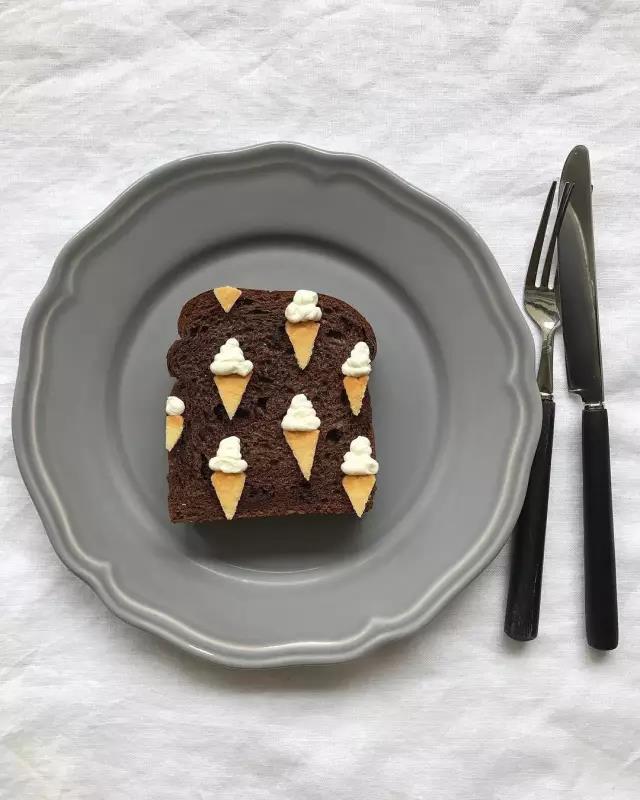 除了白吐司外也可以用巧克力吐司来发挥创意!在黑黑的巧克力吐司上画上白白的奶油冰淇淋。冰淇淋在这里使用酸奶油。