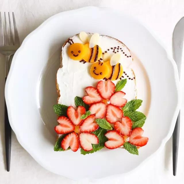 在ins上除了森映子小姐的作品外,还有一位同样十分有名气的nayoko054小姐的作品,她的作品的难度高一些,而且想象力十足。使用的材料不止局限于果酱,也会使用新鲜的水果或其他食材。图片里这个花丛中的蜜蜂,就是用草莓、薄荷叶、芒果、杏仁片等制作的。