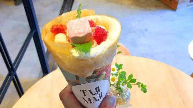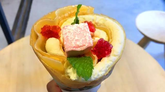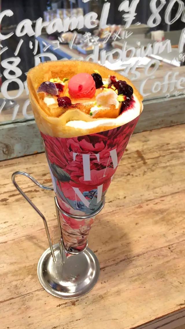 这里的可丽饼不只在视觉上让人惊艳,味觉上地道的口味也同样让品尝的人感动。这间「TAJIMAJI」,其实是在东京以超难订位而闻名的小酒馆「Ata」所打造的可丽饼店。在法国学艺的主厨,最讲究的是湿润又Q软的饼皮,延长煎烤的时间让饼皮有着酥脆的口感。鲜奶油调整了脂肪比例,做出浓郁却不腻口的味道。而且放在可丽饼里的配料也都是店家自制的,马卡龙、棉花糖、鲜奶油,甚至连糖渍三色堇都是在隔壁的厨房手工制作的。