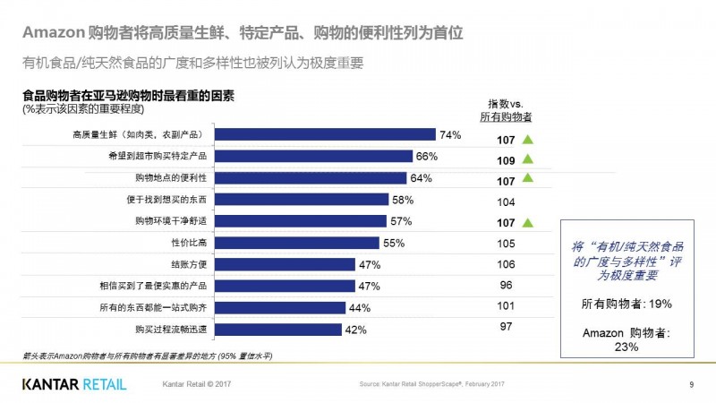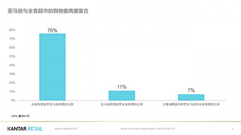 亚马逊的经济模式将会使全食超市更有价格竞争力,并且通过不同的方式把自然生活方式普及给更大的受众。据Kantar Retail数据表明,全食超市的购物者偏年轻化,更富裕,且呈现购物爱好多样性。而Amazon的购物者对生鲜品质的要求也与全食超市较为匹配。