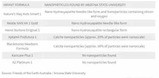 受环保组织“地球之友”(澳)委托,美国亚利桑那州立大学的纳米技术团队测试了7款在售的澳大利亚婴儿配方奶粉,发现雀巢超级能恩金盾1段和然萃维佳思敏1段这2种奶粉中含针状羟磷灰石(hydroxyapatite)纳米微粒。