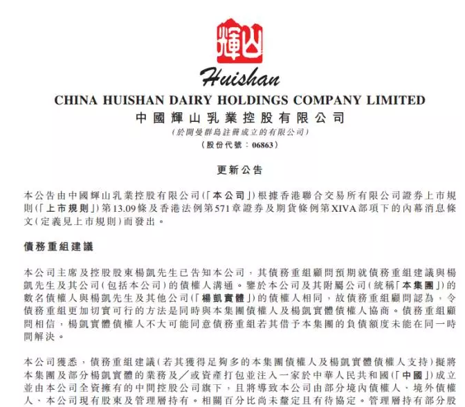 早在6月的公告中,辉山乳业就宣布,杨凯已委聘深圳市富海银涛资产管理股份有限公司为债务重组顾问,负责就可能进行涉及集团及杨凯所拥有公司整体的债务重组安排提供意见,以及协助与债权人制定及协商可能进行的重组。新的公告则披露了开展重组的可能形式。