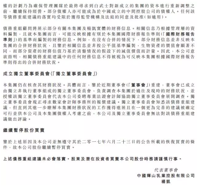 公告进一步解释,辉山乳业管理层持有部分股权的计划,是为确保最终寻求到“白武士”对新成立的集团的资本进行重新调整之前,管理团队继续保持经营。部分债权人亦可能成为于中国成立的中间控股公司的债权人。任何该等债务重组建议的落实均受限于获得监管机构及法庭的同意及批准。