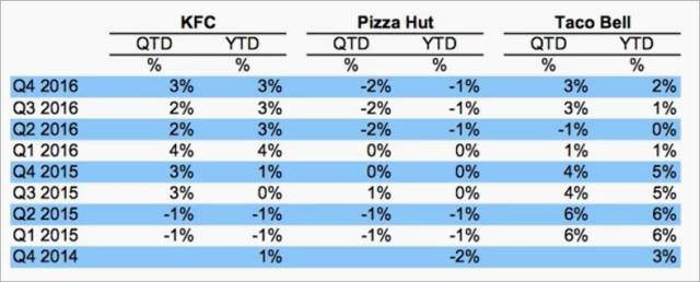 必胜客业务无起色已经不是中国一个地区的问题了,必胜客全球业务在最近一年都在经受可比同店下跌的状况,成为百胜集团业绩的巨大包袱。百胜已经先后出售了澳洲和英国必胜客大半店铺的特许经营权。