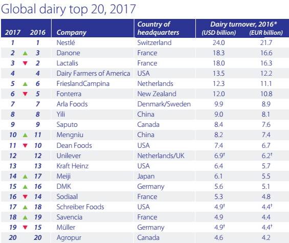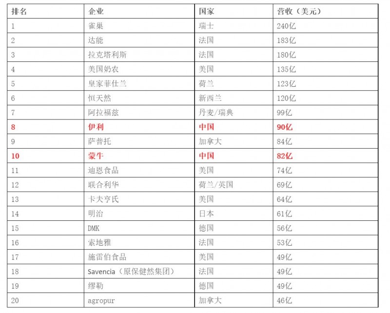 7月12日,全球最大的专注于农业与食品相关产业的商业机构之一荷兰合作银行发布了2017年“全球乳业20强”榜单,伊利乳业排名第8与上年持平,蒙牛乳业排名上升一位,首次杀入榜单前10强,再次刷新了蒙牛在全球乳业的排名成绩,迈入全球乳业的第一阵营。