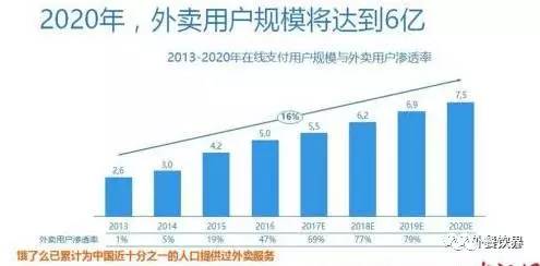 而且,市场的高峰应该是由用户的需求带动引发的,预计外卖行业还将不断扩张,到2020年前后,中国的互联网支付人口应该会超过7.5亿,外卖渗透率在80%左右,6亿人会成为在线外卖的消费用户,而O2O外卖市场交易额将突破7000亿。