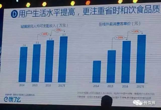城镇居民可支配收入从2014年到今年年中分别是2.9万、3.1万、3.4万,3.7万,最高增速为2016年的10%一直保持稳定上升;而居民的在线外卖消费客单价增速为29%,远高于可支配收入速度。
