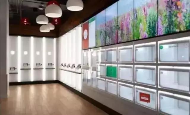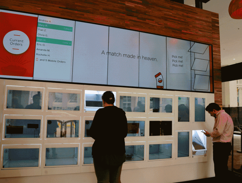 付完款,机器会提示你到取餐区取餐。取餐区的墙面上布满装有玻璃门的小格间和一个大屏幕,大屏幕会通知你在哪一格取餐,小格间的玻璃门也是个电子触屏,上面显示取餐信息,顾客直接点击屏幕打开柜门,拿出用一次性饭盒装好的食物。