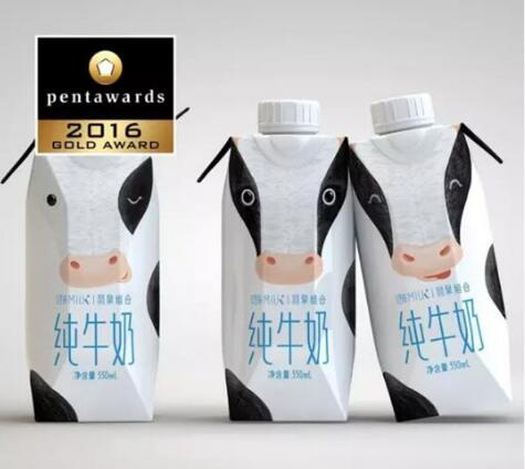 蒙牛嗨!milk,包装以黑白色块塑造出奶牛形象,且颜色对比鲜明,容易识别,蒙牛凭借这款包装获得了Pentawards金奖。