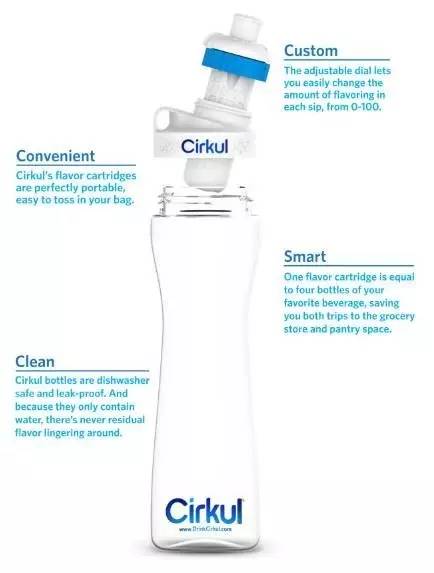 Cirkul的技能和The Right Cup 一样,也是能把白开水变成饮料。和 The Right Cup 的香味饮料有异曲同工之处。它的瓶盖里有维生素、电解质或咖啡因,所以水一经过瓶盖就成了饮料。
