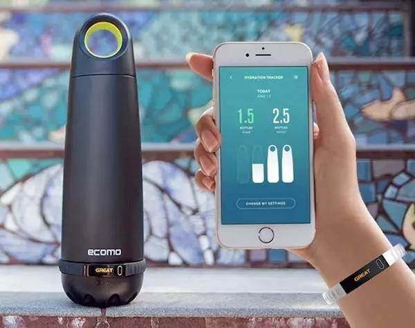 跟踪饮水:Ecomo 的瓶身上其实也藏了一个具备跟踪饮水习惯的智能手环哟。 手环与水瓶主体通过蓝牙连接,不仅可以告诉使用者瓶中的水质情况,还能根据使用者的饮水时间和饮用量,适时地给出补水建议。