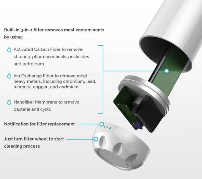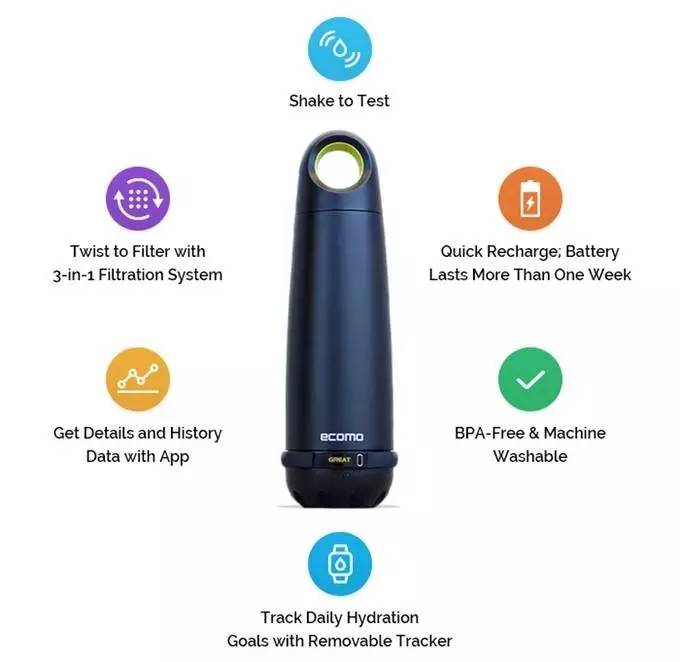 过滤杂质:如果瓶中的水质并不理想,周围又没有更可靠的水源该怎么办呢?你只需将 Ecomo 的瓶身这样轻轻地扭上几圈,瓶中的水就像魔术般变成可以放心饮用的洁净水了。神奇得让人起疑对不对?其实,Ecomo 的瓶身中暗藏有一个由活性炭纤维、离子交换纤维、纳米纤维膜组成的三合一过滤装置,可以通过在瓶中旋转的动作过滤掉水中的绝大部分有害物质,变“脏水”为“净水”。