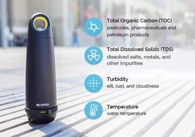 检测水质:要想放心地喝水,首先要从掌握水质情况开始。用 Ecomo 接满水,轻轻地摇一摇,独特的检测模块便能探测出水中的有机物残留(如微生物、化学药品、石油衍生物等)、无机物残留(如重金属)和其他杂质(如泥沙、灰尘)的含量。根据水质情况,瓶子下方的会亮起“差”“适中”“好”三种提示语,更详细的信息还可以在配套手机 APP 中参看。