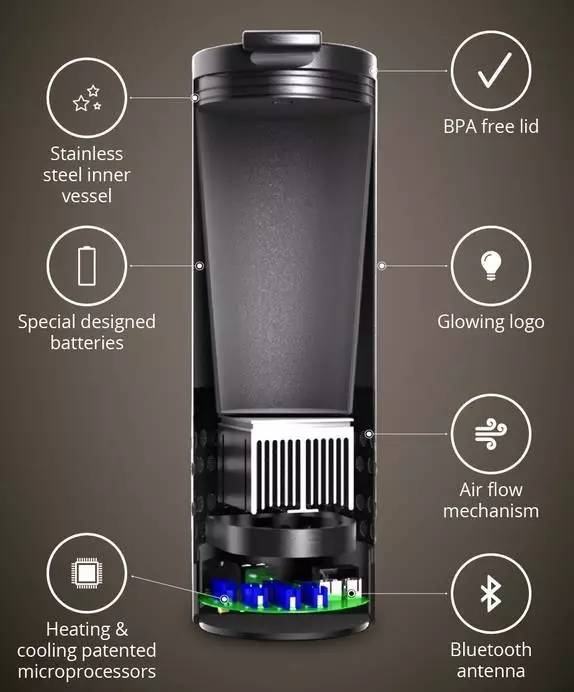它的工作原理是运用底部的冷热芯片,通过蓝牙连接从而实现工作,续航能力可满足5小时使用,2.5小时就可以充满电。