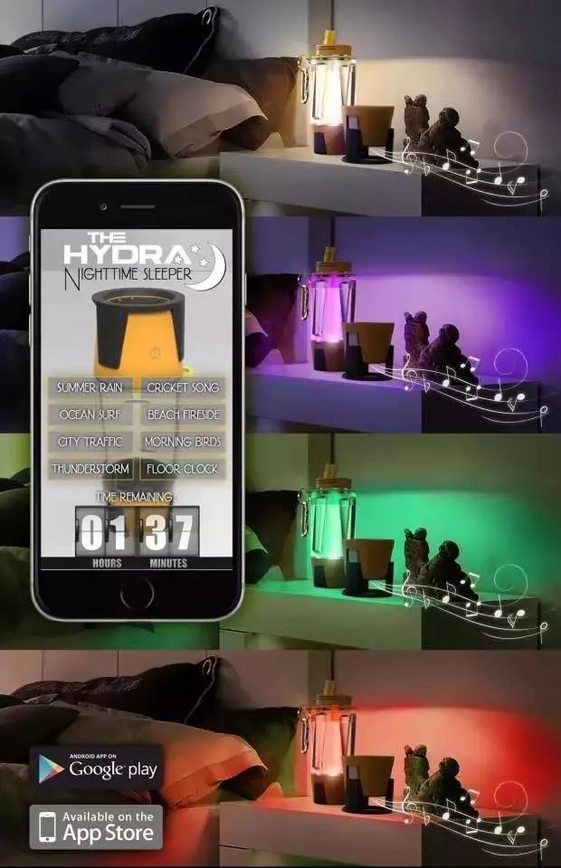 在晚上睡觉时,Hydra还可以作为你的夜灯,连接到你的健康app,观测你的睡眠质量。通过调节灯光颜色和音乐,来帮助你达到深度睡眠。这些音乐都是自然中的声音,例如,夏天的雨声、蟋蟀的叫声、清晨的鸟叫声、潮汐的声音等等。