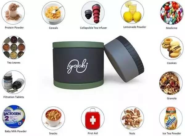 Golchi保温杯采用了模块化的设计,由上中下三个部分构成,可以同时放置冷热水、谷物、药片等等。