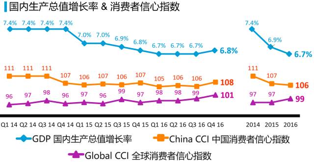 尼尔森研究发现,2016年消费者信心指数在经历了三个季度的平稳后,于第四季度明显增长,从105%上升至108%。就业预期的提升为拉动四季度信心指数提升的主因,而消费意愿的加速增长更是促进了全年的消费者信心指数企稳回升。