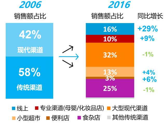 尼尔森指出,渠道多样化使得整体的市场格局日益复杂。在理性消费的前提下,消费者在各渠道各取所需,完成日常购物。2006年主要集中在现代及传统两大渠道,经过10年的发展,线上、专业渠道(母婴/化妆品店)、大型现代渠道、小型超市等渠道相继出现,供消费者的选择渠道越来越多,其竞争也愈发激烈。