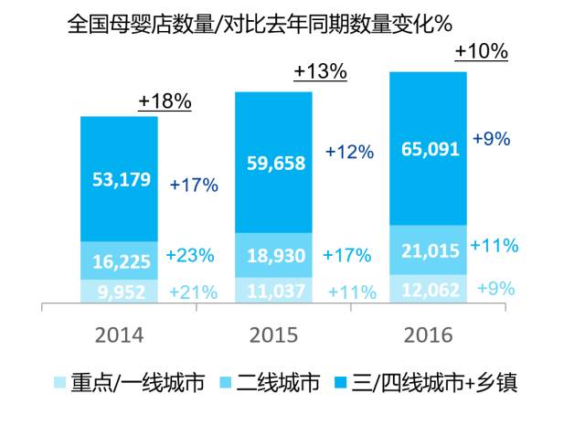 一、从整体母婴市场来看,近年来母婴消费接近双位数增长,消费升级和品类中的新产品都带动了销量的增长。过去两年,母婴用品实体店的数量仍在增加,但是增速放慢。分不同的城市级别来看,二线城市在2016年增幅较其他基本城市略快,低级别城市与重点/一线城市增幅相同。