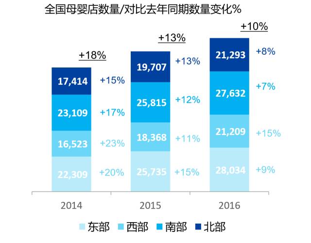 过去两年,母婴用品实体店的数量仍在增加,但是增速放慢,分不同的城市级别来看,二线城市在2016年增幅较其他城市略快,低级别城市与重点/一线城市增幅相同。分不同的区域来看,在2016年除西部地区增长速度有所上升,其他三个地区的母婴用品实体店的数量增长速度明显放缓,尤其是东部和南部地区。