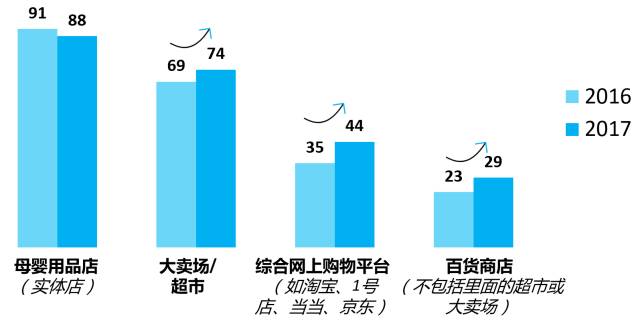 其中,母婴用品店(88%)和卖场超市(74%)是购物者最常去的两个渠道。另外,今年大卖场超市、网上购物平台以及百货商店的渗透率有所上升。