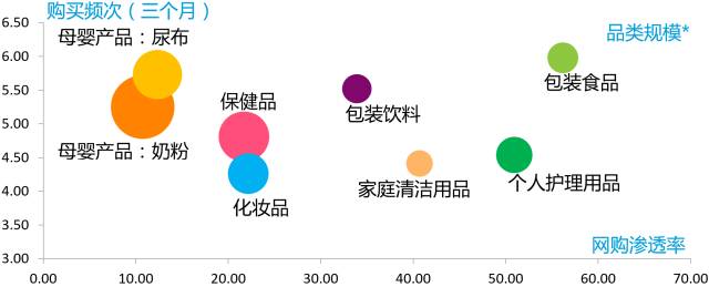 1. 母婴产品是购买频次最高的品类,但是其网购渗透率偏低,因此未来还有非常大的发展空间