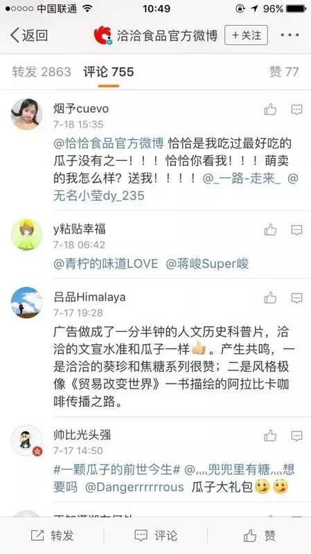 但大家看完这支片子,还是会或多或少的留下一些深刻印象。从评论和转发内容就能窥出大家对于这支短视频发自心底的喜欢:有人调侃自己“作为一个历史专业的学生也不知道瓜子的历史”,在这里获得了课本外的冷知识;有人觉得片中的洽洽吉祥物“艾嗒”很可爱;有人打趣说“我是河南嗑瓜子冠军,给我一顿瓜子,可以磕到地老天荒”;有人直言不讳“这样的广告不会招人烦”;还有的回忆起了洽洽的味道,“儿时吃是年的味道,长大吃是回忆的味道”;更有细心的网友总结出了片子的特点,“广告做成了人文历史科普片,文宣水准和瓜子一样赞,让人产生共鸣”……