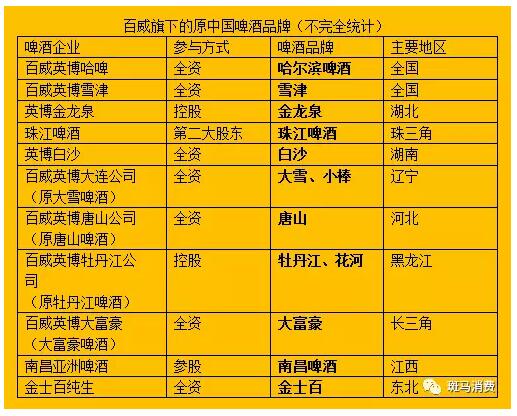 在这之后,百威英博在中国市场的并购从未停过,2011年河南维雪、大连大雪,2012年牡丹江啤酒,2013年河北唐山,2014年吉林金士百,2015年增持珠江啤酒……