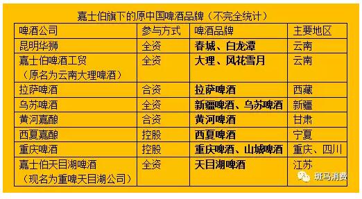 1995年嘉士伯收购惠州啤酒厂进入中国市场,2003年调整策略,全资收购云南的华狮啤酒和大理啤酒,扶持地方品牌。