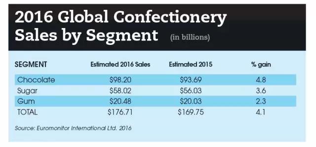 Euromonitor数据显示,巧克力、糖和口香糖销量都有所增长,2016年全球糖果业的增长了4.1%,总销售额从1687.5亿美元增长到1767.2亿美元。其中,巧克力品类的增长处于领先地位,销售额增加了4.8%;而糖果,多亏了耐嚼糖果品类,其销售额增长了3.6%;口香糖品类获得了2.3%的销售额增长。虽然达不到过去令人惊喜的增长幅度,但也向前迈出了体面的一步。