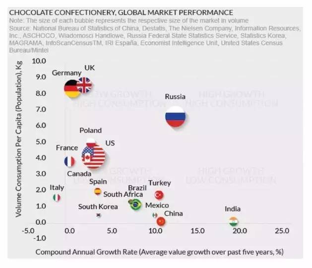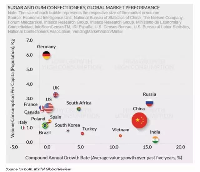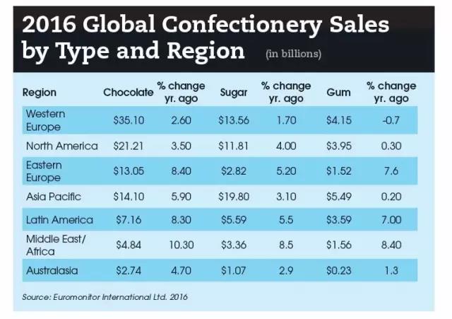东欧和拉丁美洲仍然是糖果的重要消费区,增长率分别为7.8%和7.1%。未来几年,在墨西哥经济和人口结构年轻化的推动下,拉丁美洲将成为极具吸引力的糖果市场,尤其是当巴西克服了政治问题和经济低迷,委内瑞拉回归到正常状态的时候。