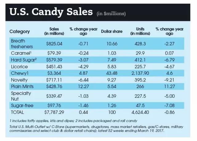 Mintel在全球糖果市场年度报告中指出,2016年糖果品类的主要问题在于,糖果和零食之间的界限越来越模糊,许多巧克力和糖果配料更多地被应用于零食品类;其他问题则是围绕着消费者对糖的可接受程度。此外,糖果销售渠道的改变也改变了市场的发展,随着超市和其他大众渠道的结帐柜台不允许摆放糖果,销售商们正在争先恐后地寻找其他途径,与此同时,越来越多的糖果产品开始进入了网购渠道。