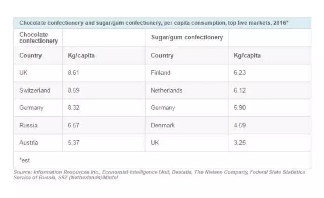 但在发达市场,情况却有所不同:在2015年至2016年间,美国和英国的糖果和口香糖的销量基本平稳;而在德国和俄罗斯销量出现了下降情况(德国下降了2%,俄罗斯下降了4%)。