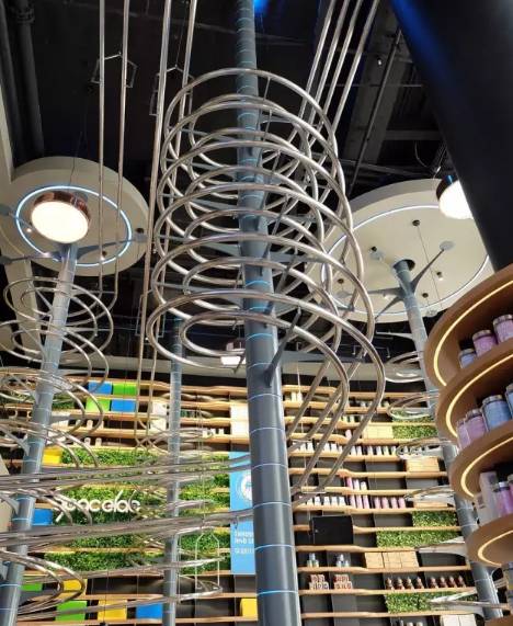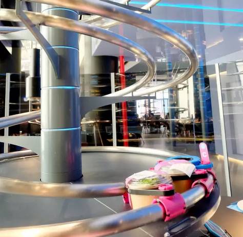 餐厅去人工增人效用科技来武装,又有新玩法了:双回路多螺旋轨道系统,利用重力驱动;不需要制动装置,依靠轨道的螺旋角度减缓速度,最终让餐品完好地“飞”到食客面前。