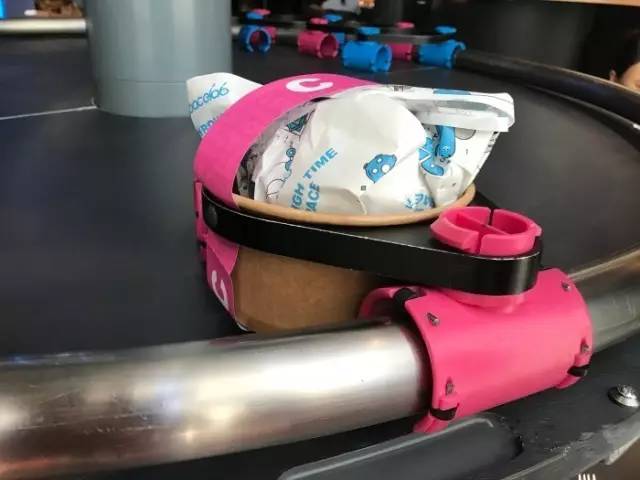 三桌共用一个传菜轨道,每桌的餐垫颜色各不相同,分别为蓝、粉、黄三色。滑轮餐车也配有相应的三种颜色,顾客取走相对应颜色的菜品即可。
