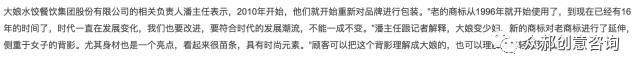 就拿2012年品牌升级logo一事来说。由于受到山寨、老化等影响,用了16年的大娘水饺logo,决定升级,一夜之间大娘变少妇。当时品牌负责人解释说,希望品牌年轻化,大家对于大娘水饺能够采用新的眼光。