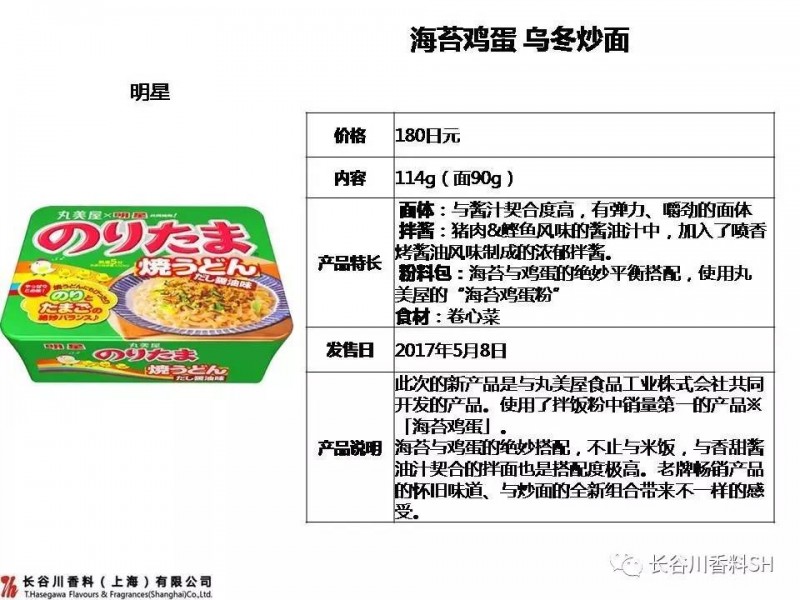 与丸美屋共同开发的产品,将在拌饭粉中销量第一的产品“海苔鸡蛋”粉应用到拌面中去。带来不一样的味觉感受。