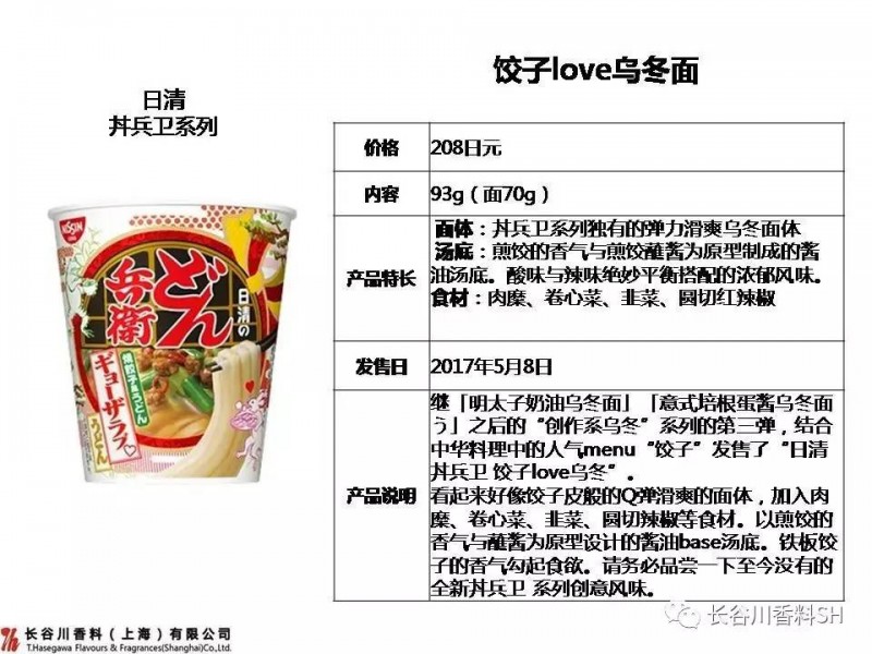 该产品为乌冬面创作系列产品的第三弹。将铁板煎饺的香气与吃煎饺用蘸酱应用到汤底中,制成酸辣可口、喷香四溢的风味。