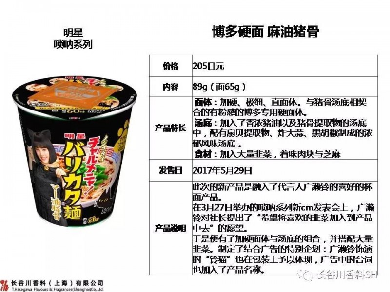 该产品将人气女性广濑铃作为代言人,产品也特别融入了广濑铃的喜爱元素—韭菜。在TVCM中,以“铃猫”形象出演。产品将博多加硬、有粉感面体与猪骨汤底的结合,并加入香浓猪油。