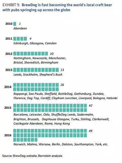 上图:2010年至2016年,BrewDog 精酿啤酒覆盖的酒吧数量及地区增长