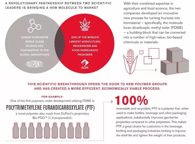 与ADM公司合作,杜邦推出了一种新型的生物基材料,它衍生自美国能源部根据原材料对制造业的重要性而鉴定的12种化学结构单元之一,可以转化为多种高附加值的、生物基的化学材料,或是在许多应用中提供高性能的材料。