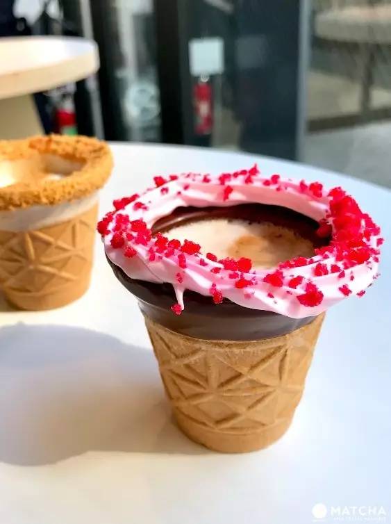 接下来就是选择喜欢的饮品,除了咖啡也有提供不含咖啡因的可可和抹茶拿铁。决定后店员会将现磨的香浓咖啡加入甜筒中,专属自己、独一无二的咖啡就完成了。